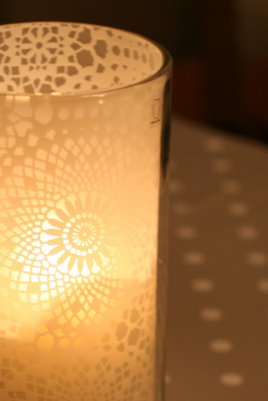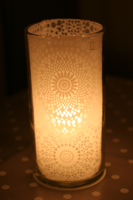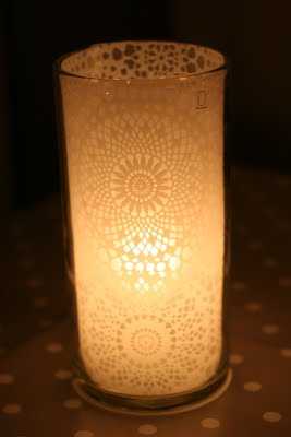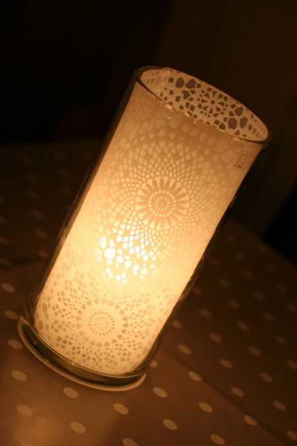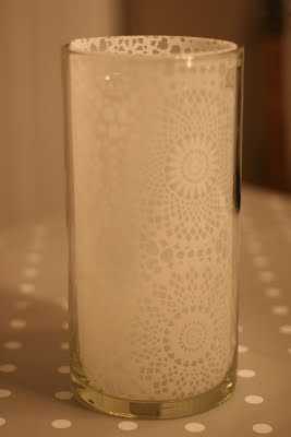 Mottan er svo stíf að það þarf ekkert að líma eða standa í neinu öðru veseni en að stinga þessu ofan í vasann. Mjög mikilvægt að passa samt að kertið komi hvergi nálægt eða að það sé eldhætta af þessu, nota t.d. sprittkerti. Þessi vasi er t.d. svo víður að ég þurfti ekkert að skera af mottunni til að minnka hana.