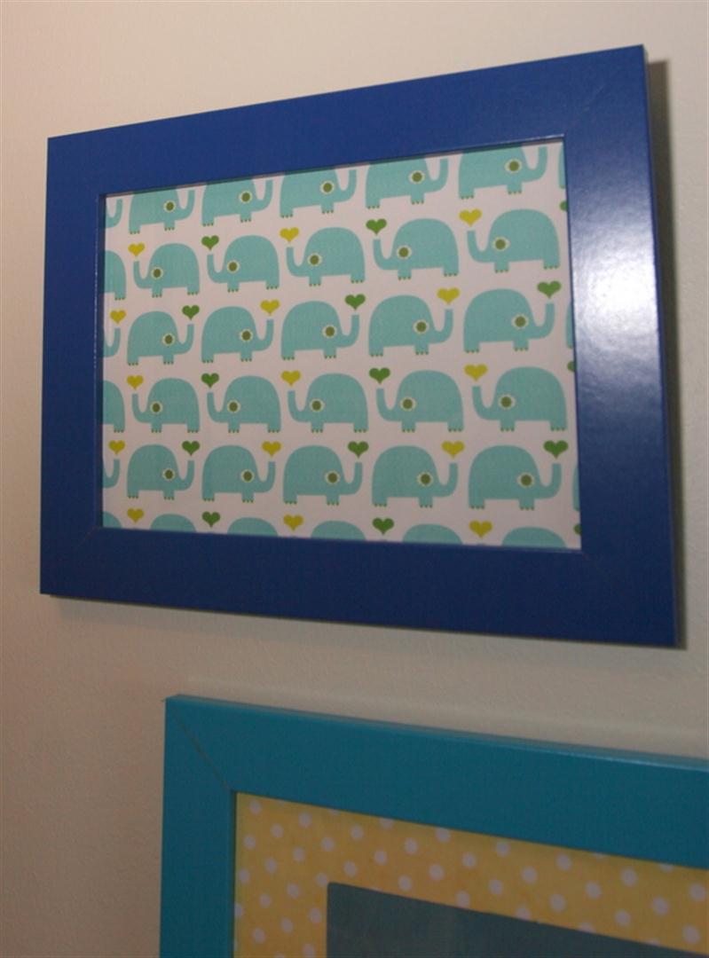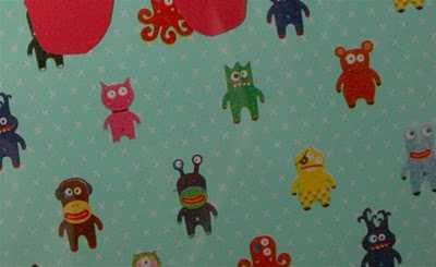 Síðan var það skrímslið góða. Innblásturinn var gjafapappír sem fékkst í Söstrene Grenes. Ég valdi það skrímsl sem að mér þótti sætast og ekki var verra að hann var rauður eins og ramminn, og mig langaði í meiri rauðann lit inní herbergið..