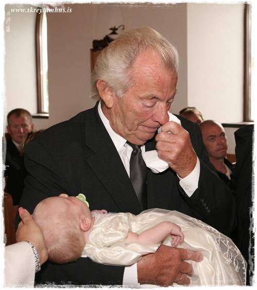 …en svo varð úr að ég varð ófrísk og eignaðist litla manninn 2010.  Það kom því ekki annað til greina en að láta skíra hann í höfuðið á pabba.  Við reyndum að halda þessu leyndu, þrátt fyrir að flesta grunaði í hvað stefndi, og töluðum við séra Jónu Hrönn og sögðum henni að við ætluðum að fá pabba til þess að halda á drengnum undir skírn, en hann vissi ekkert af því.  Presturinn var alveg guðhrædd (viðeigandi!) og hafði miklar áhyggjur að við værum að fara svona með 76 ára manninn – að koma honum svona á óvart.