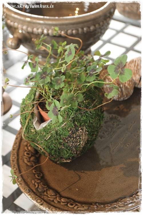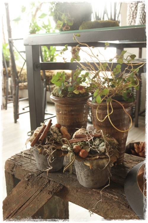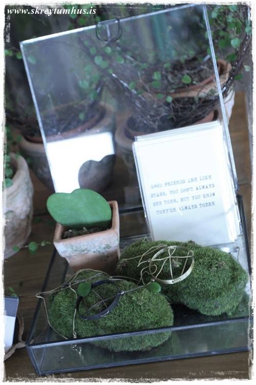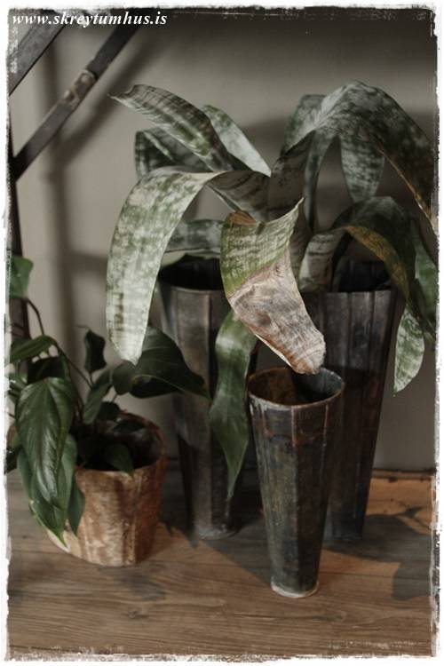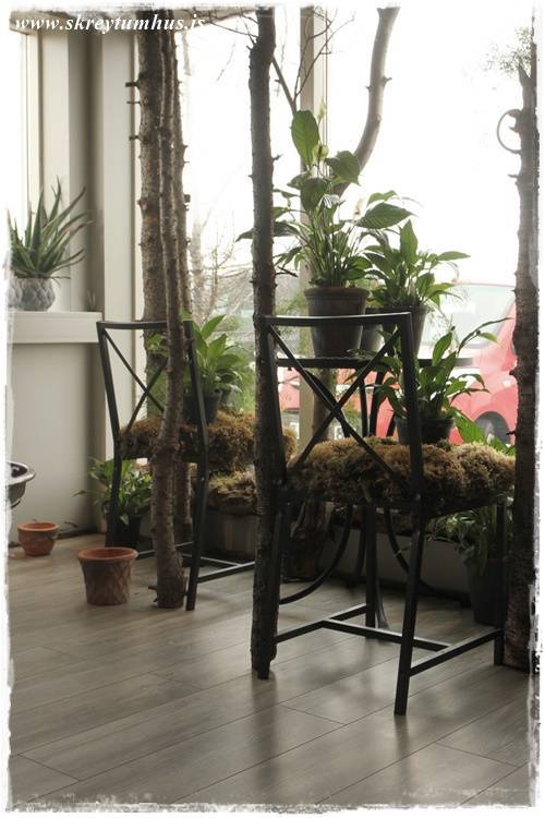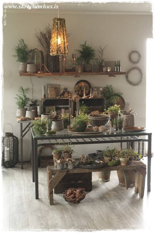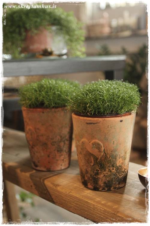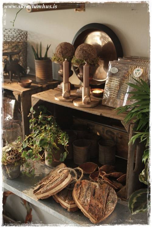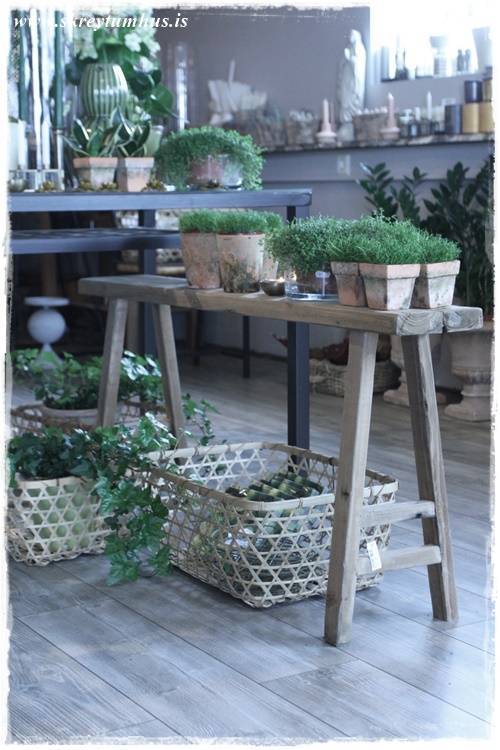 Þetta er grófleiki, timbur – dökkir pottar – málmar – mosi, dásemdar mosinn – börkur, og annað slíkt. Sem er svo yndisleg andstaða við fínleikann, fegurð blómanna – skærir litirnir – fínleg krónublöðin – gler, og allt þetta sem er í blómabúð. Þetta eru andstæðurnar sem að vega hvor aðra upp, salt og pipar, gróft og fínt!
