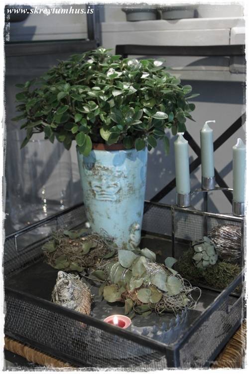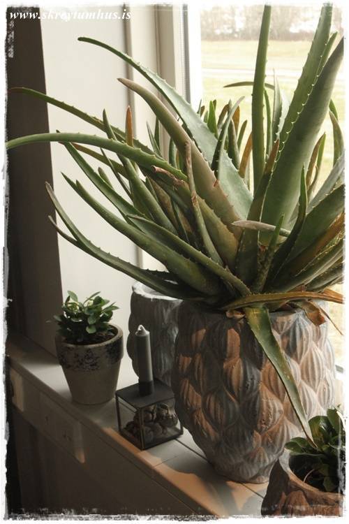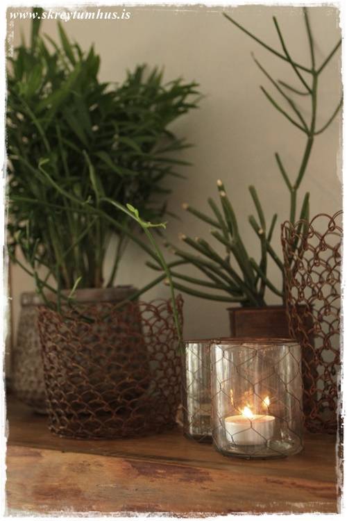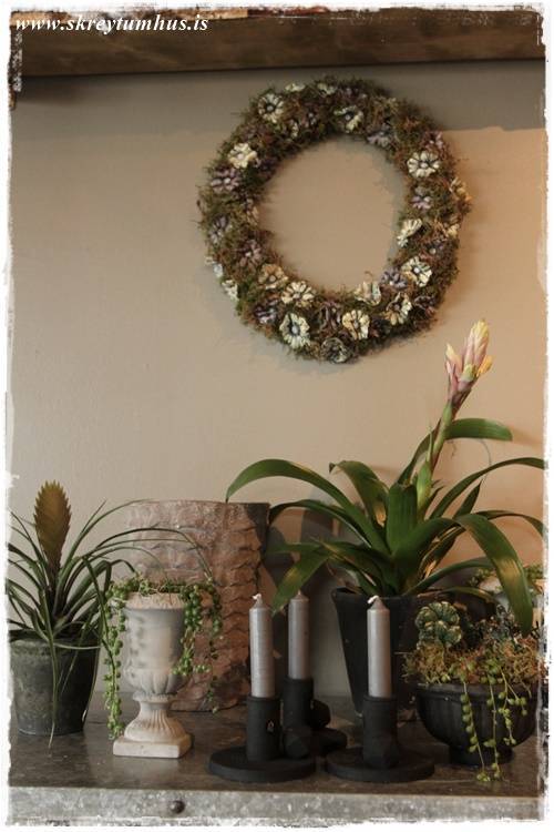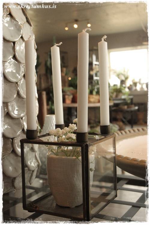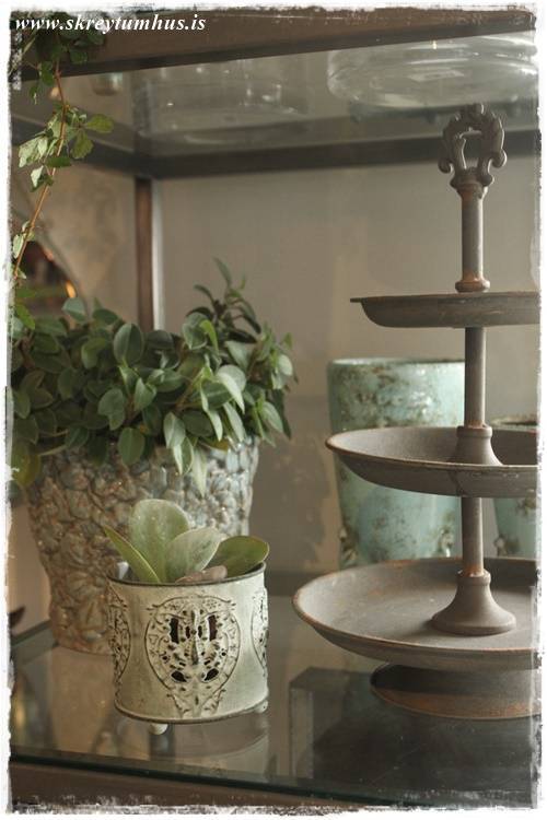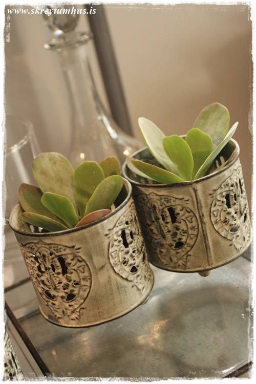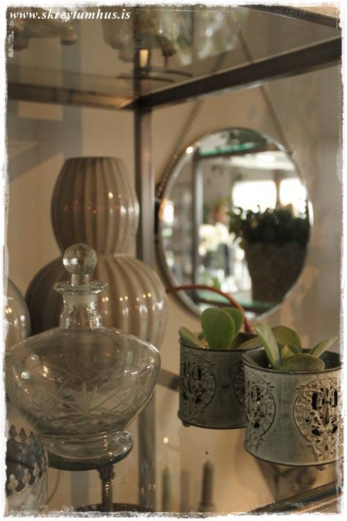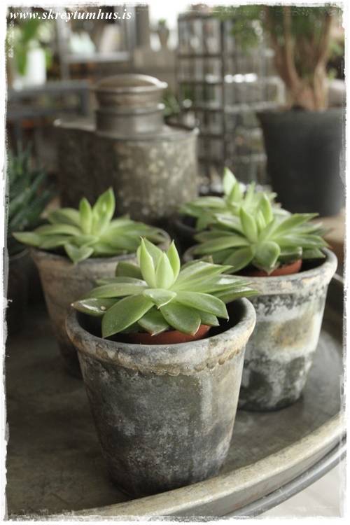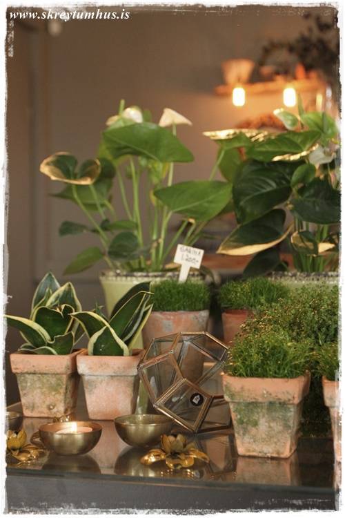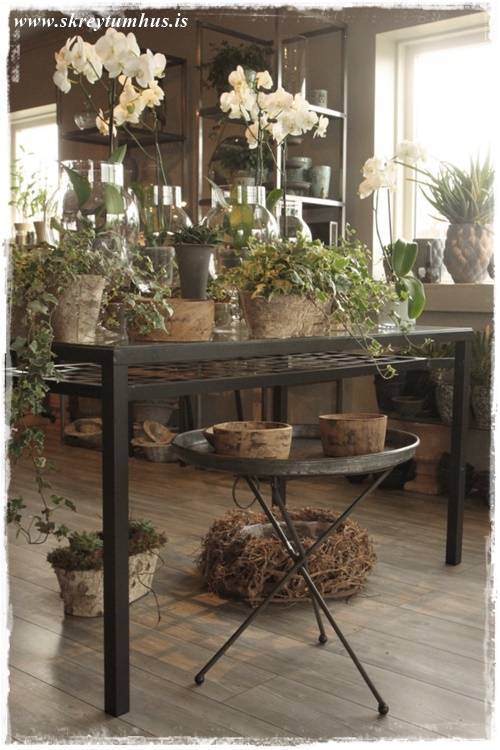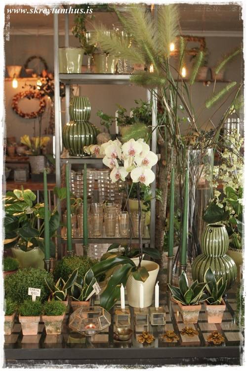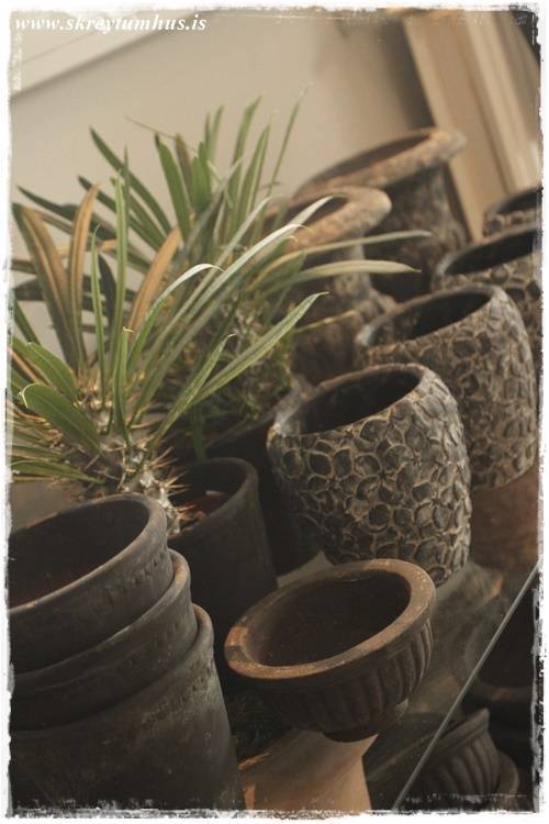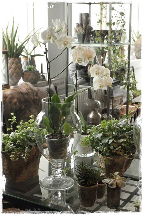 …eins og sést vel hér – orkídeurnar í glervösunum eru eins og perlur – eins og skart. Njóta sín svo vel með öllum grófu pottunum 🙂