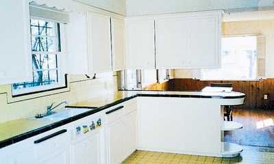 Hér er eldhús sem var í upprunalegt í húsi frá 1948.