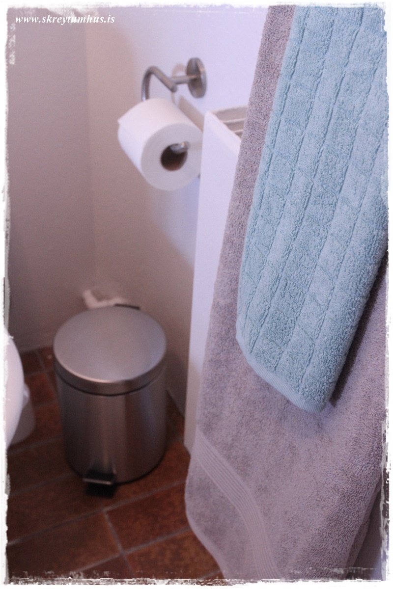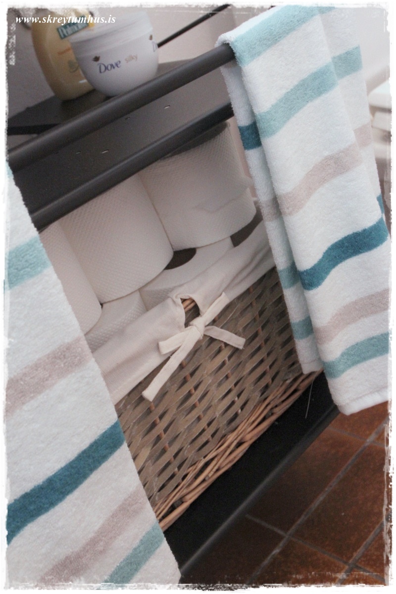 …og þetta felur wc-pappírinn og annað sem er ekkert skemmtilegt að horfa á.  Karfan passaði ekki alveg þarna undir, út af vaskalögnum, en ég lét þær bara fara ofan í körfuna og raðaði pappír í kring…