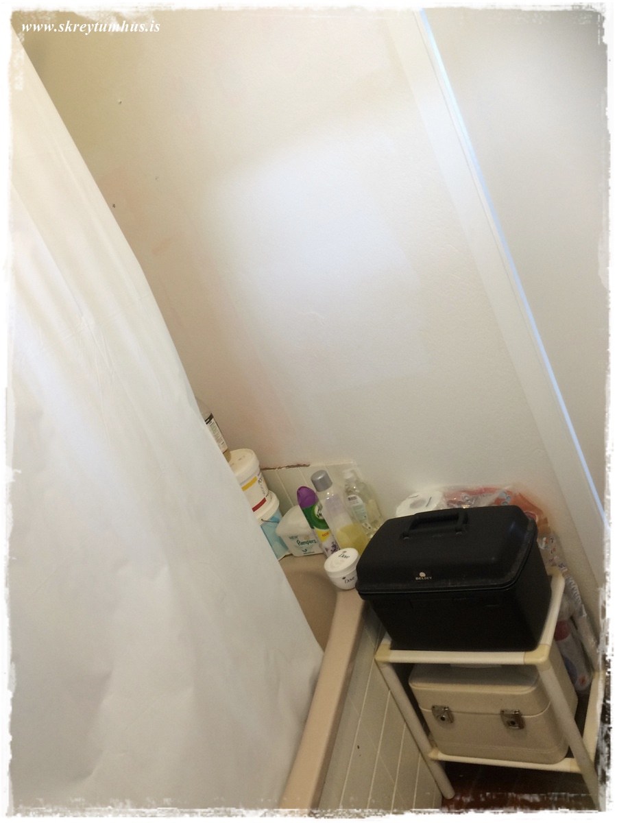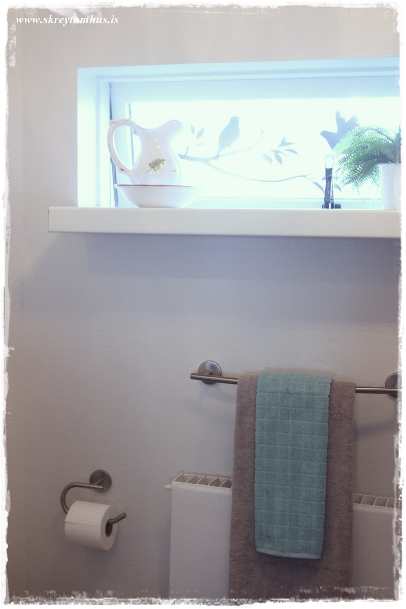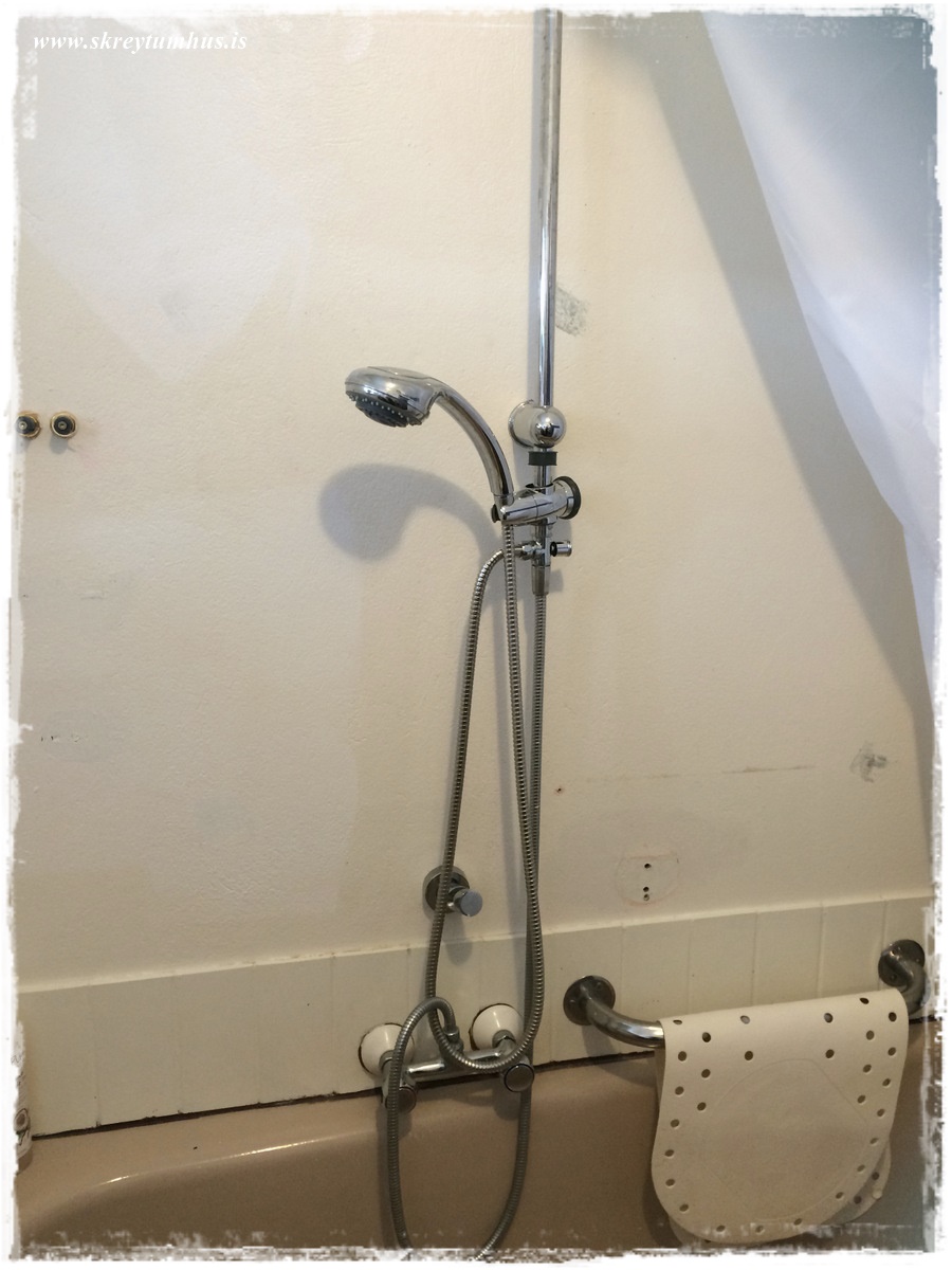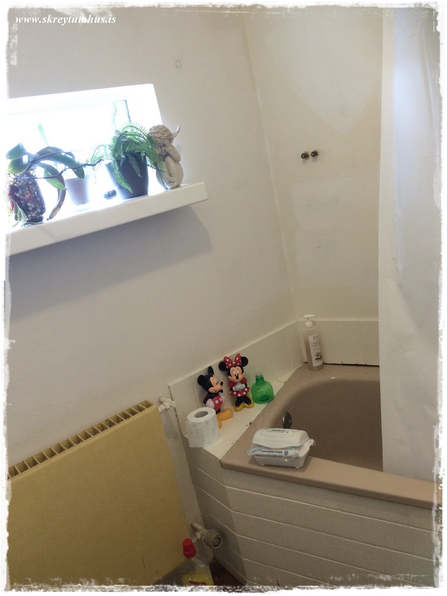Frænka mín elskuleg flutti fyrir einhverju síðan í íbúð og baðherbergið var frekar þreytt – eins og gengur og gerist.  Við systurnar ákváðum að reyna að aðstoða hana og gera baðherbergið boðlegt fyrir dömu 😉 og, þar sem elskulegt húsbandið mitt var í “nauðungarfríi” (þurfti að klára sumarfrí sem var að brenna inni) þá samþykkti hann af einskærri hjartagæsku og almennilegheitum að koma með í þetta og vera okkar einka-, málari, kýttari, borari, skrúfari og raftengiliður í þessu öllu. Í stuttu máli, hann reddaði okkur alveg og stóð sveittur í 2 daga í alltof litlu baðherbergi – eins og krabbi í of litlum kuðungi 🙂