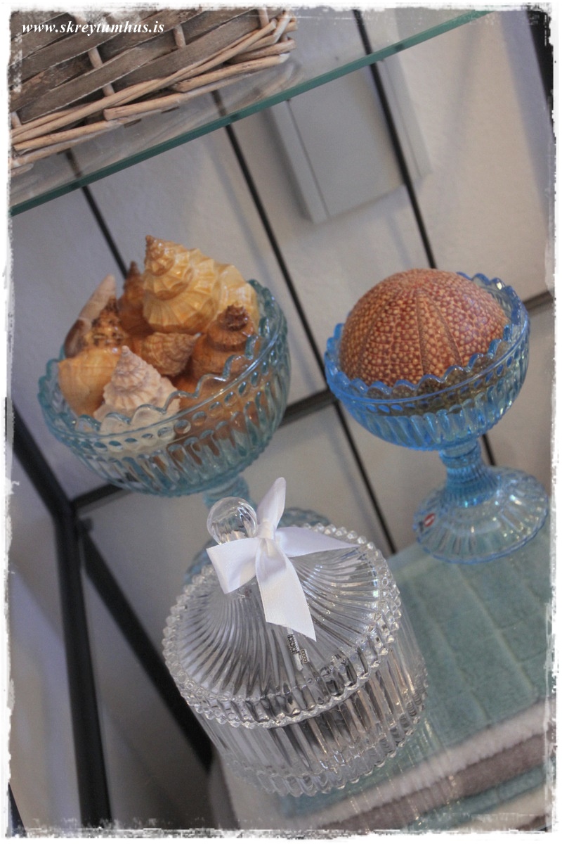 …frænkan átti þessar Iittala skálar bara í geymslu í skápnum sínum, og þær smellpössuðu inn í litaþemað.  Gaman að geyma í þeim svona gamla kuðunga og ígulker…