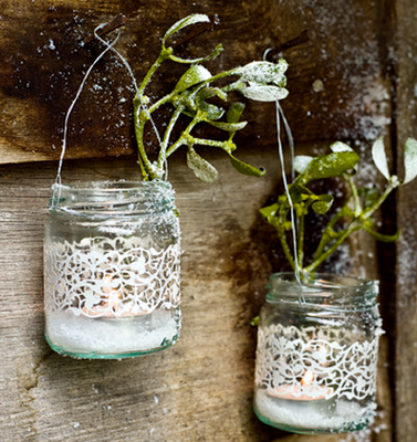 Ég ætla að gera svona sprey-blúndu-krukkur í sumarbústaðinn, frábær hugmynd 🙂