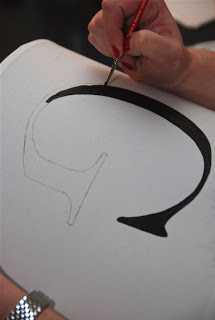Notast síðan við mjóann pensil til þess að mála eftir stafinum, kannski væri hægt að nota líka penna ef að hann smitar ekki út frá sér. Örugglega best að byrja innan í stafinum frekar en með útlínunum, þá sérðu ef penninn/pensillinn smitar út frá sér.
