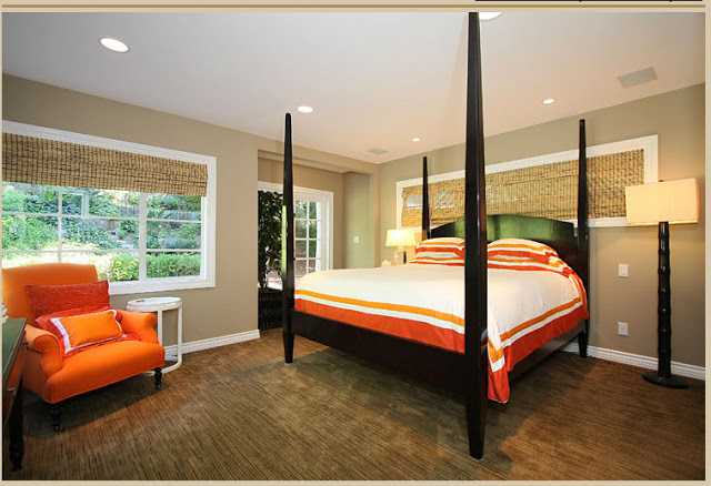 elska þetta herbergi, hlýji liturinn á veggjunum, dökk húsgögn, sterk litur á móti með hvítum hreinum tónum, og svo hlýleikinn af bastgluggatjöldunum – elska þetta 🙂