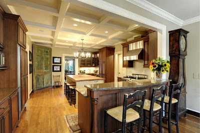 eldhúsið, takið eftir loftinu, og eyjunni, og ljósakrónunni yfir eyjunni, og, og, og…