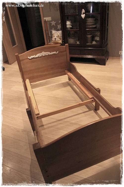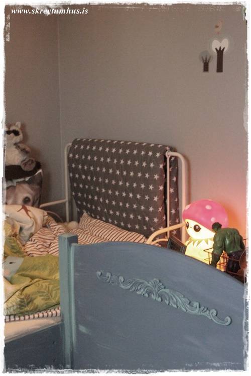 …en það var alltaf vitað að þetta væri bráðabirgðalausn, því mér fannst rúmið verið helst til kvenlegt, með réttu eða röngu, og þar að auki langaði litla manninum í “sitt” rúm.  Han vildi ekki vera með Diddí-rúm í sínu herbergi 🙂