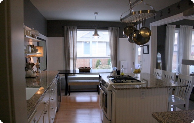 Helstu breytingarnar voru að rífa niður efri skápa, mála neðri skápa, stækka eyjuna með því að bæta bókaskáp við endann á henni.  Settu panil á veggina, stækkuðu borðpláss með því að bæta við vínkæliskáp, smíðuðu bekk og settu granítplötur.
