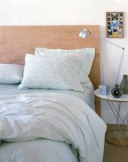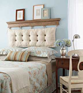 Síðan er það bara þessi klassíska hugmynd.  Viðarplata, bara t.d. spónaplata, sem er látin standa á gólfi, á fótum eða fest við vegginn, en nær vel upp fyrir rúmið.  Best væri að festa aftan á hana einhverja smá kubba þannig að hún standi ekki alveg klesst við vegginn.  Síðan er hægt að láta skera út fyrir sig svamp og festa hann á plötuna.