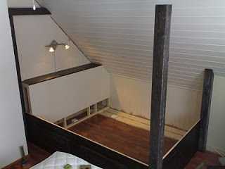Þau gættu þess að gera hillu fyrir ofan rúmið til þess að vera með “nátthillu”..