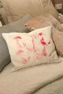 Í púðaflórunni á rúminu er þessi með rauða mynstrinu bestastur, jólagjöf frá dótturinni – framleiddur af henni í leikskólanum.