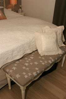 Bekkinn við endann á rúminu keyptum við í Ilvu. Að vísu var bara hvítt áklæði á honum, eins og sést hérna fyrir neðan þannig að það var bara eitt í stöðunni, skipta um áklæði..