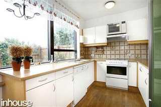 Litlu framkvæmdirnar urðu sem sé aðeins stærri en þær áttu að verða.  Hent var niður veggjum, breyttum öllum loftum, skiptum um gólfefni og hitt og þetta.  Við skoðuðum einu sinni og ég var ekki fyrr kominn inn í húsið en ég vissi nákvæmlega hvað ég vildi gera.  Hvaða veggir áttu að fara niður og sá þetta fyrir mér um leið.  Hér er eldhúsið eins og það var, eins og sést þá var það langt og mjótt – en með þessum stóru flottu gluggum og ég gat ekki beðið eftir að henda niður vegginum með græna ísskápnum, þarna hægra megin…