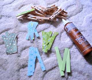 Síðan er bara að mæla úr stærðina á þvottaklemmunum og fara svo í að klippa úr pappírsmiða sem að passa yfir klemmurnar.