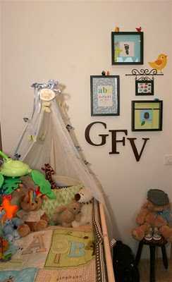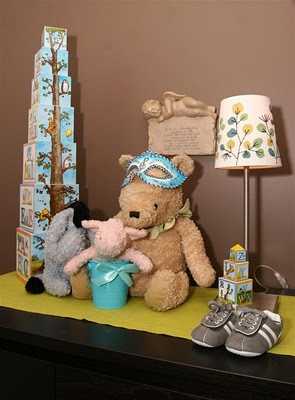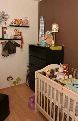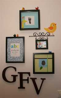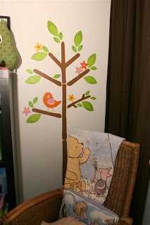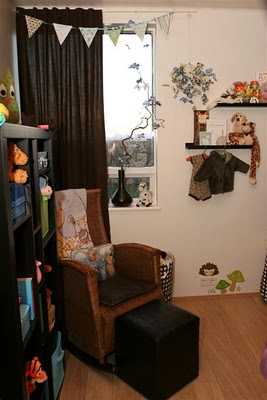 Ég er með vegglímmiða, sem að ég keypti í Target fyrr á árinu, og er skipt upp um herbergið. Tré er á einum vegg, ungi litli er á myndavegginum og síðan sést litla moldvarpan ásamt sveppunum hjá gólfinu (bóndinn varð strax mjög hrifin af því að beina athygli barnsins að innstungunni og mun auðvitað verða keypt öryggislok þar á áður en barnið fer af stað). Enn á ég ónotaða límmiða úr settinu, meira að segja tvær uglur – en ég ákvað að reyna að overdósa ekki á uglum og íkornum og öllu því sem að með fylgdi.