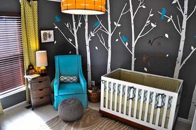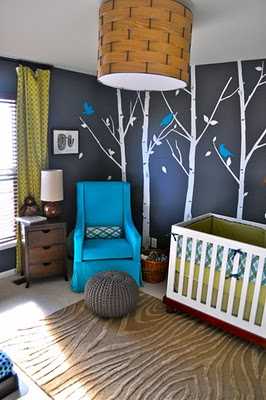 Geggjað barnaherbergi fyrir lítinn gaur, veggirnir í gráu og poppað upp með lime-grænum og túrkish-bláum. Frábærlega flottar veggskreytingarnar.