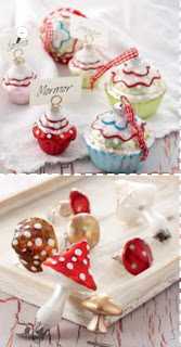 Eigum við að kíkka nánar á nokkra hluti. Sjáiði litlu múffurnar fyrir nafnspjöld. Mér finnst þetta ekki vera bara jóla – sé þetta alveg fyrir mér í barnaafmælum. Svo finnast mér þessir sveppir þarna fyrir neðan ekkert slor!