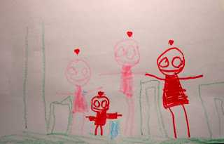 Listaverk krílannna okkar eru líka alltaf dásamleg, höfuðfætlur og allir vinir þeirra.  Af hverju ekki að fjárfesta í striga og leyfa barninu að mála hann eftir hjartans lyst, eða að biðja barnið að teikna fjölskylduna.  Ómetanlegt listaverk.