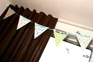 Önnur hugmynd með skrapp-pappír er að gera fána.  Hef séð þetta víða úr efnum og flóknari útfærslur.  Hér er þetta einfaldlega skrapppappír, gataður og band þrætt í gegn.  Tekur um það bil 5 mínútur.