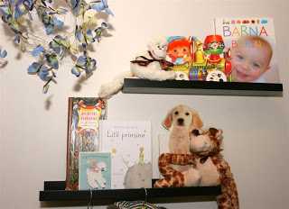 Það er fátt sem er leiðinlegra en berir veggir.  Eins og sagt var í fyrri pósti þá er sniðugt að setja Ribba hillurnar frá Ikea á einn vegg og setja í þær bækur, ljósmyndir, bangsa og aðra skemmtilega smáhluti Pez kalla?).  Með stærri krakka sem eru farin að stunda í þróttir er t.d. sniðugt að festa neðan í þær króka þannig að hægt sé að hengja upp verðlaunapeninga og annað slíkt.  Svo er alltaf hægt að nota sömu hugmynd inn í herbergi hjá unglingsstelpum og nota krókana fyrir hálsfestar.