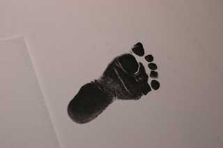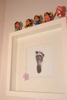 Þegar að krillan mín var smásnuð þá keypti ég stimpilpúða, stóran og svartann, og notaði til þess að taka fótafarið hennar.  Ég setti myndina síðan í ramma, skellti á einu litlu fiðrildi (límmiði), og þetta er búið að hanga í herberginu hennar síðan.