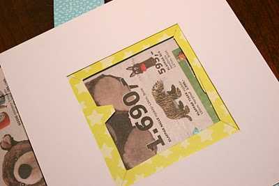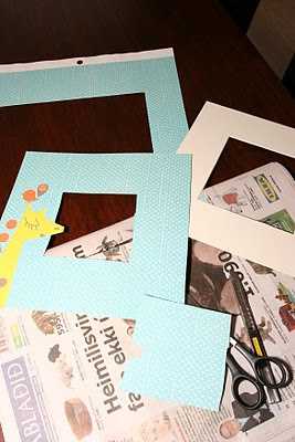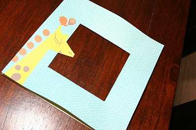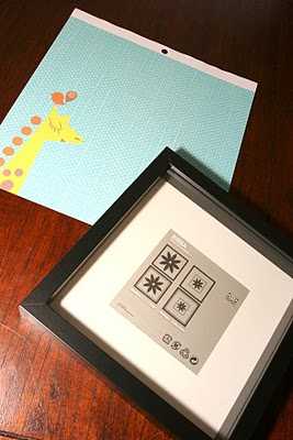 Þegar gott fótafar var komið á blað þá var bara að ákveða hvernig ætti að setja það upp á vegg.  Ég á þó nokkuð af skrapp-pappír sem ég nota í allt annað en að skrappa.  Í þessu tilfelli fann ég blað í flottum lit og mér til mikillar ánægju þá var mynd af gíraffa og fuglum á því, þannig að ég þurfti ekkert að bæta við “aukahlut” – eins og fiðrildið í fyrra skiptið.