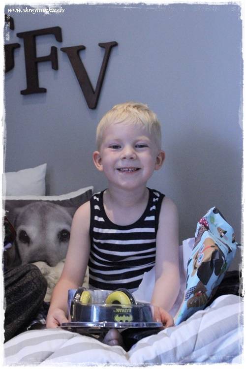 En fyrst af öllu, þá var afmælisdrengurinn vakinn með pökkum, söng og möffins…