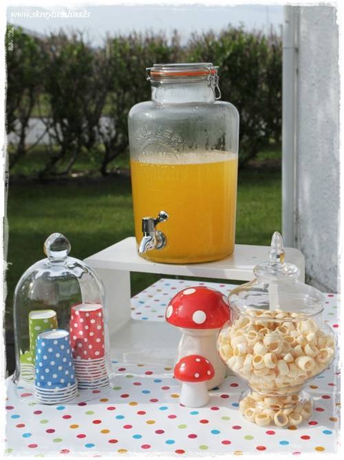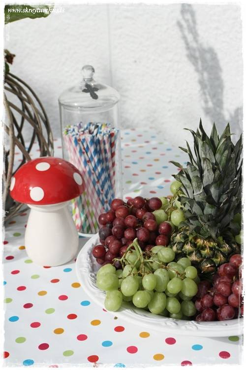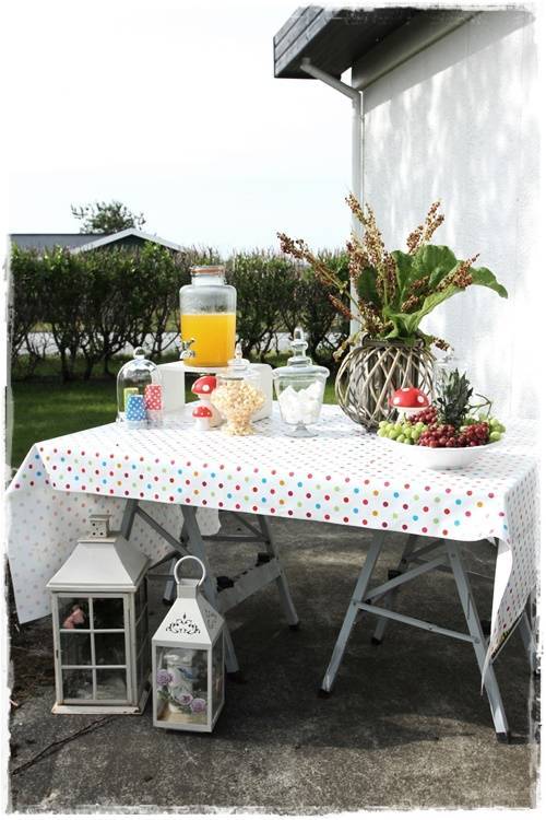 …setti þennan sumarlega og sæta plastdúk með doppum, og ákváð þá að skreyta með sveppunum sem eru inni hjá litla manninum til skrauts…