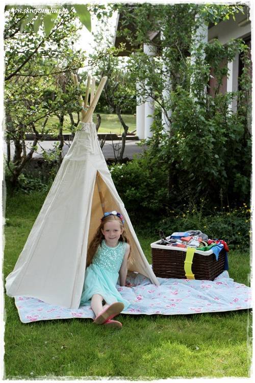 …settum upp nokkrar stöðvar, og þarna var hægt að leika í indjánatjaldinu (þetta fékkst hjá Iamhappy.is) og við settum körfu fulla af búningum á teppið, svo hægt væri að dressa sig upp…