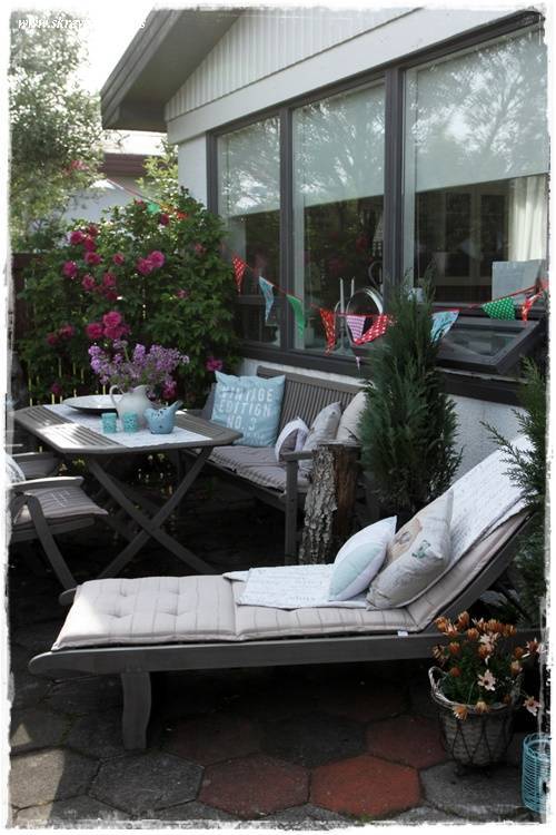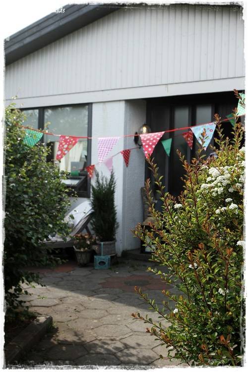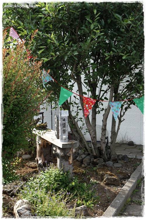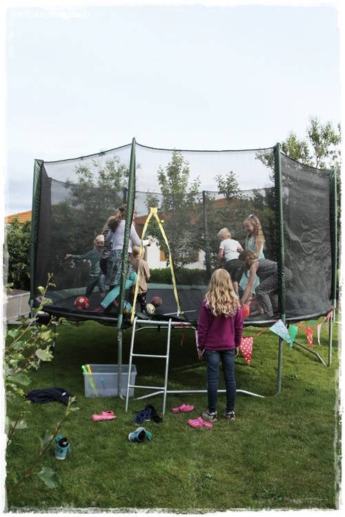 …trampólínið var líka skreytt með veifum, en þessar fást í Rúmfó og kosta bara 299kr lengjan, þannig að þetta var ódýrt, fallegt og skemmtilegt skraut í garðinn…