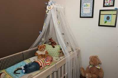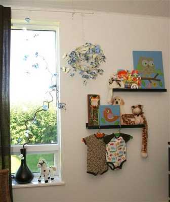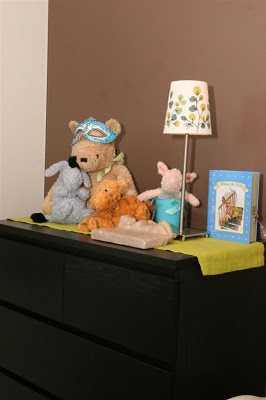 litli gaurinn minn er komin með sitt eigið herbergi, þrátt fyrir að sofa inni í herbergi foreldra sinna.  Ég ákvað að hafa einn brúnan vegg (var málaður þannig áður) og svo nýtti ég kommóðu sem að ég átti áður.  Síðan voru helstu litirnir ljós lime grænn, og ljósblár.