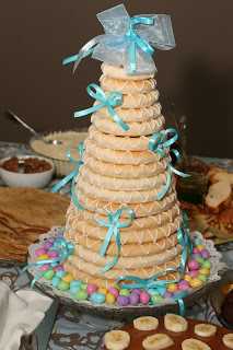 Við létum skíra son okkar núna um daginn. Ég var með ljósblátt þema, mikið sörpræs í því, og með því var limegrænt og svo brúnir tónar. Móðir mín kær barðist fyrir að koma með kransaköku (löng saga) og ég skreytti hana síðan sjálf. Mig langaði ekki að nota þessa “gömlu góðu” aðferð að festa bara nammimola á hana. Fór í Söstrene Greenes og keypti þar eina rúllu af svona bláum silkiborða, síðan átti ég skrautnálar með perlu á endanum. Lagði borðan einfaldlega saman í slaufu og stakk svo perlunál í gegnum miðjuna, og voila – þannig var komin skreyting á kökuna.