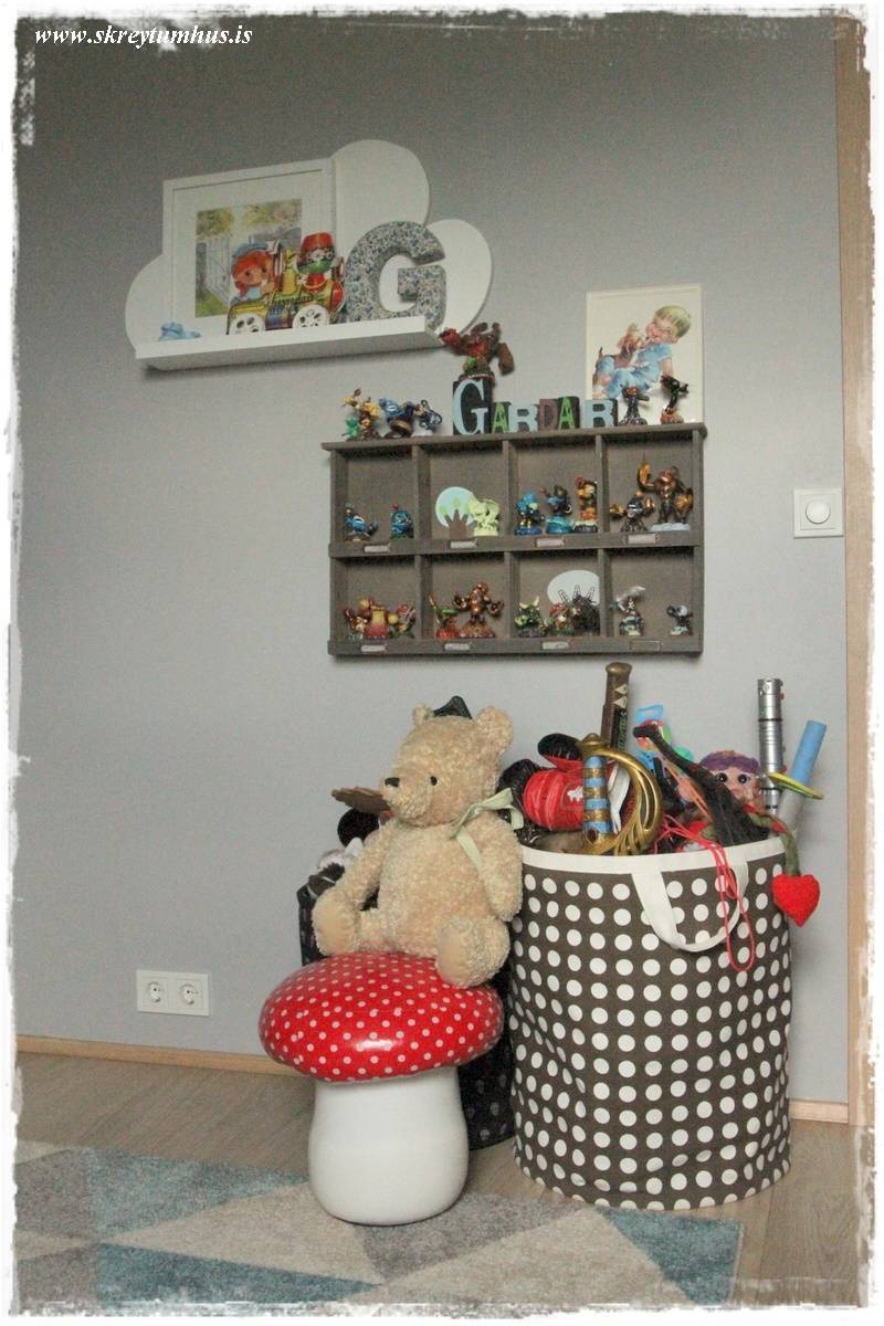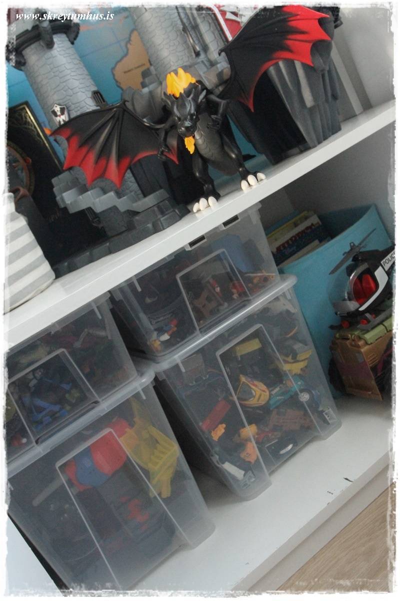 …og ég fór í Ikea og keypti geymslukassa, og flokkaði allt svona fyrir litla snyrtipinnann. Þannig að það er stór kassi fyrir stóra bíla, stór kassi fyrir faratæki, lítill fyrir Playmo og annar fyrir alls konar ofurhetjur. Þessi litli gaur er þannig að hann þrífst á svona skipulagi og hann passar sko að allt fari aftur á sinn stað.