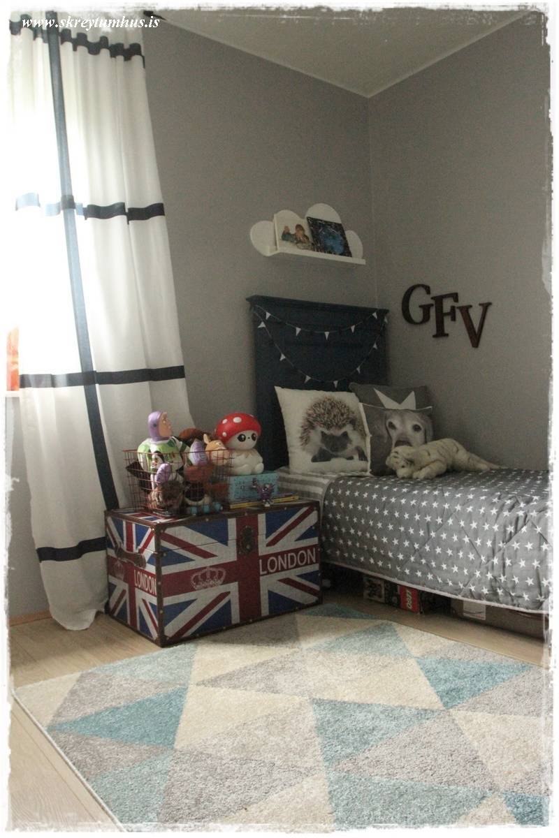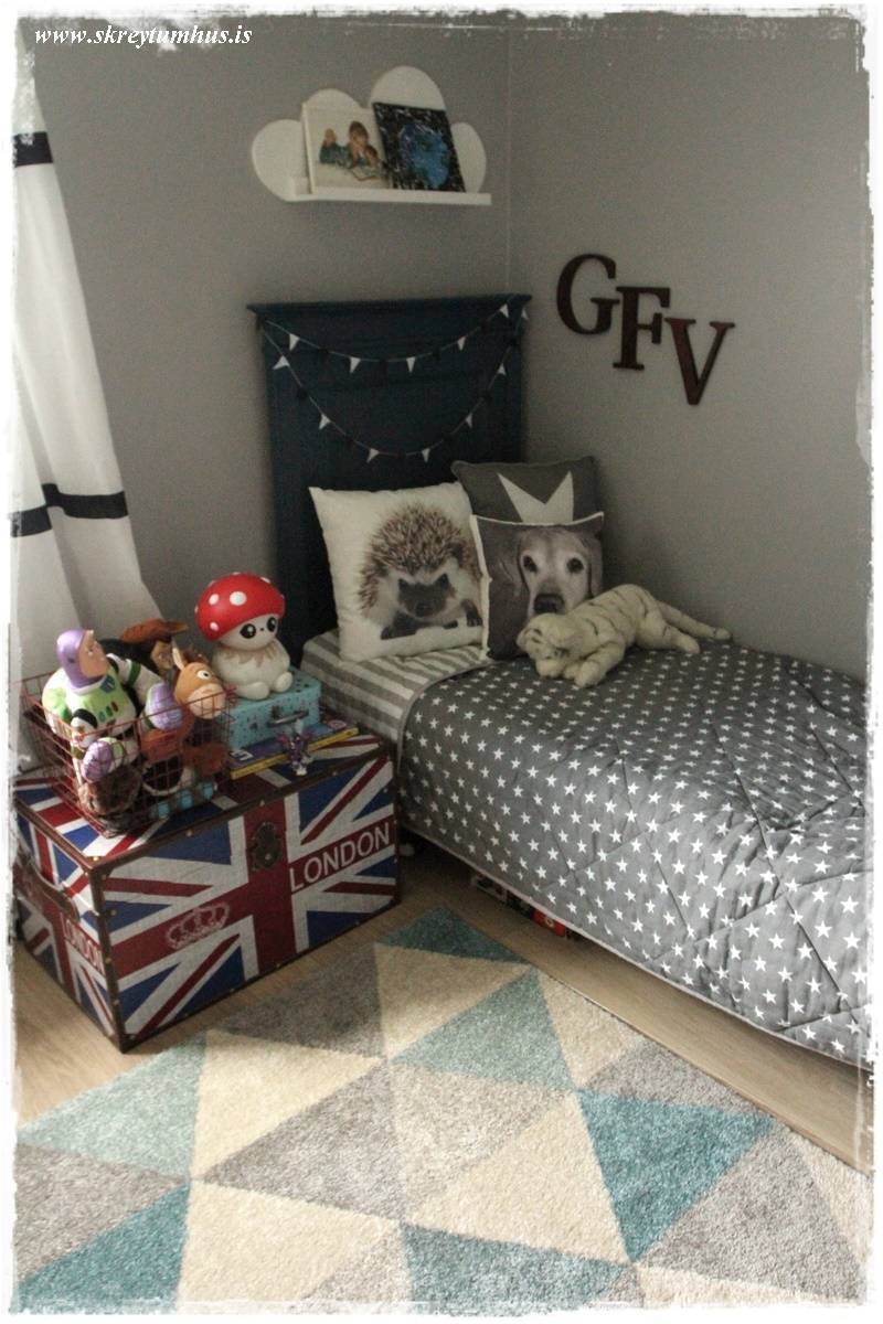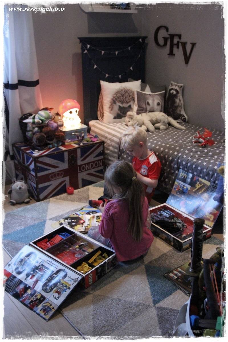 …undir rúminu sjáið þið glitta í gamla ferðatösku, sem geymir núna Lego-dótið hjá litla manninum og nokkra stóra Legokassa…