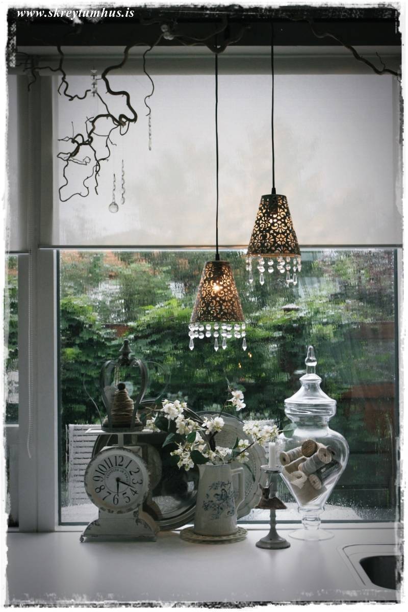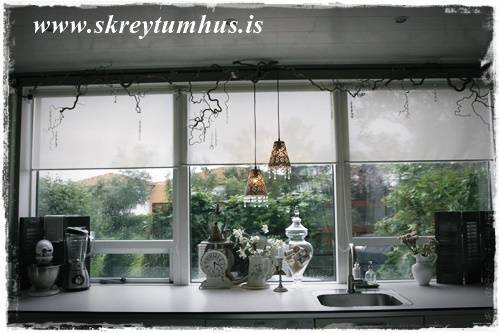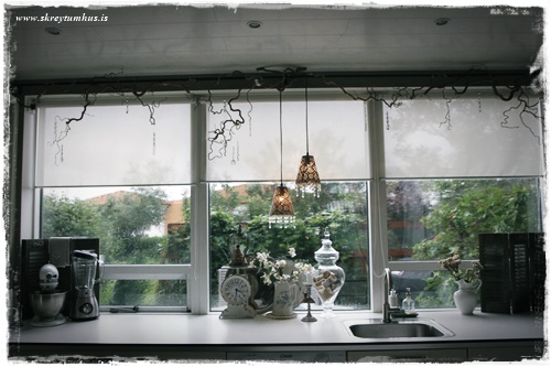 …þarna í glugganum stendur m.a. nýja stóra glerkrukkan mín, sem að ég er búin að setja alls konar trékefli og snæri ofan í…