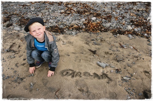 …og litli maðurinn þurfti að skrifa sig í sandinn líka…