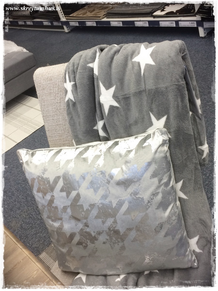 Uppáhaldið mitt er náttúrulega luktirnar tvær á borðinu (af því að ég á svoleiðis luktir 😛 ), stjörnuteppið, úlfapúðinn og trjápúðinn og líka scriptpúðinn…er voða lítil svona glimmerkerling nema um jólin þannig að ég veit ekki alveg með glimmerdótið…litli tveggja hæða bakkinn er líka í uppáhaldi. Já og bæ ðe vei…var í Rúmfó í Smáranum um daginn og keypti hrikalega krúttlegan þriggja hæða jólabakka!! Er hrikalega skotin í honum…er nokkuð of snemmt að nota hann í barnaafmæli um miðjan nóv?? 😛