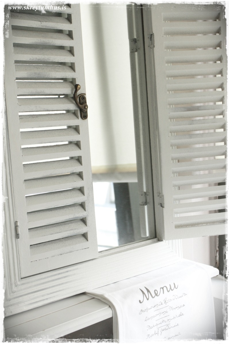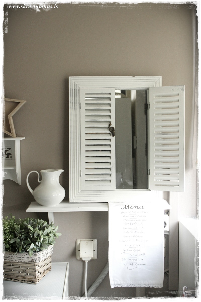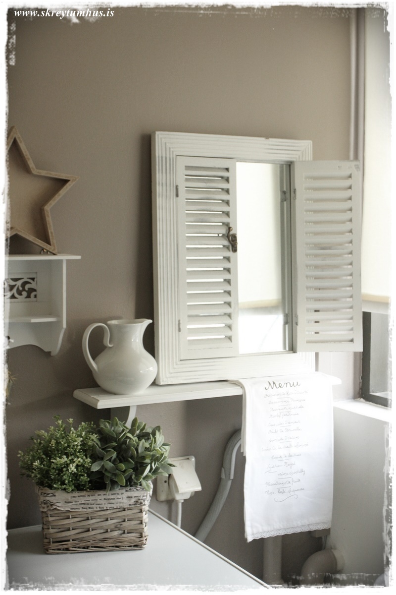 …þessi dásemdar gluggaspegill á svo eftir að hengjast upp, og þegar við setjum stöng undir hann – þá verður hægt að krútta enn meira á þessari hillu…