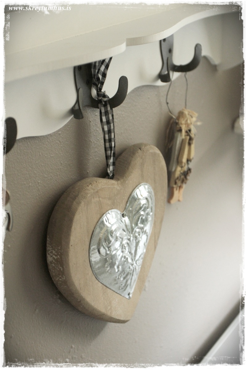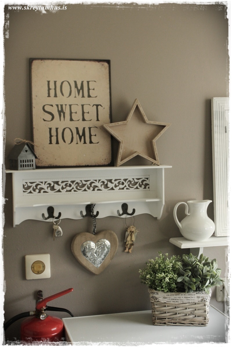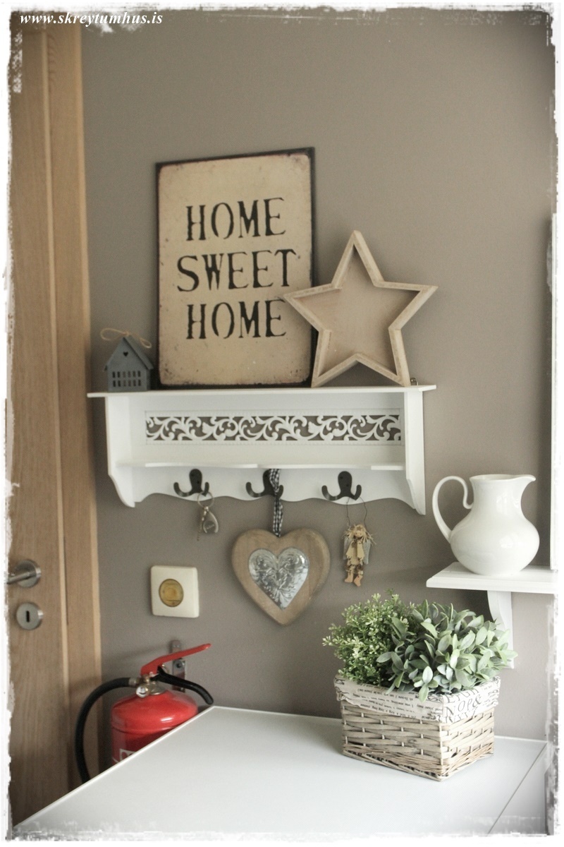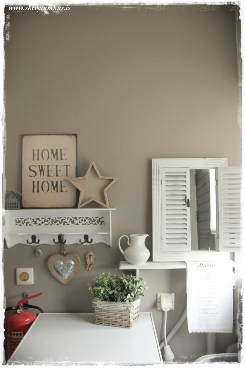 …þessi dásemdar gluggaspegill á svo eftir að hengjast upp, og þegar við setjum stöng undir hann – þá verður hægt að krútta enn meira á þessari hillu…
