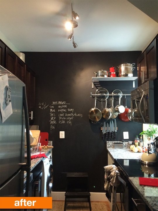 Maður hefði kannski ekki beint “þorað” að mála vegg í eldhúsi svartann, en þetta kemur alveg ferlega töff úr og virkar í raun mikið stærra og skemmtilegra rými á allan hátt!