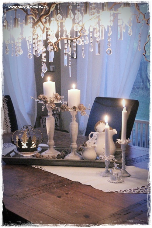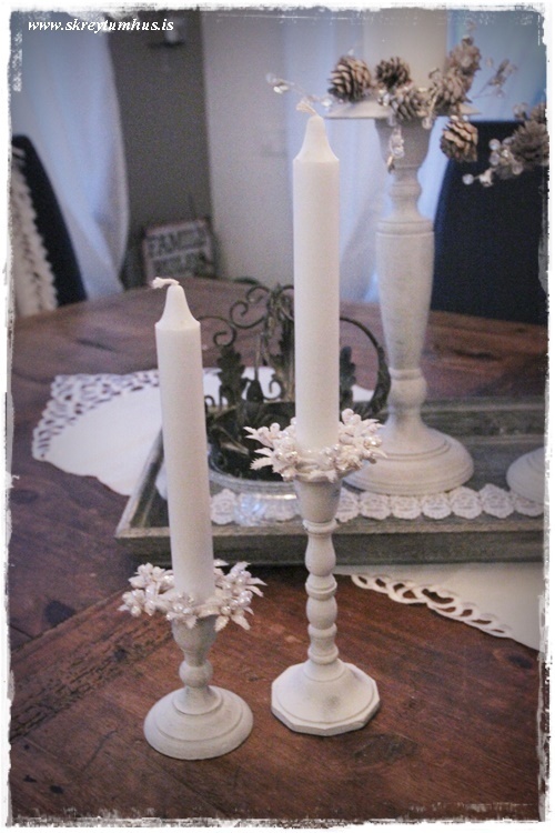 …svo eru það stærstu hlutirnir fyrst.  Þessi stjakar er þungir og alveg ferlega flottir, taka bæði kubbakerti og venjuleg.  Nú og þegar við röðum á bakka, þá er gott að hafa hæðsta punktinn aðeins til hliðar við miðju…