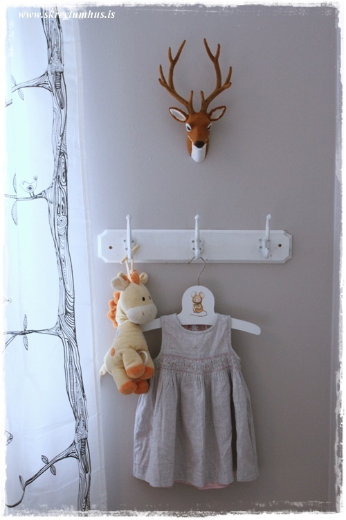 …það er algjört möst að get hengt upp kjóla eða krúttheit í svona krakkaherbergjum, og við fundum þennan snaga í Rúmfó á Korputorgi líka, alveg fullkomin stærð…