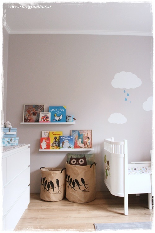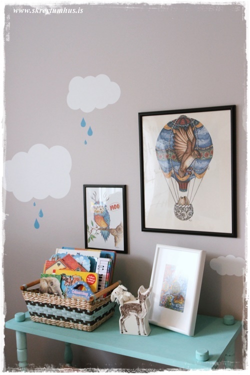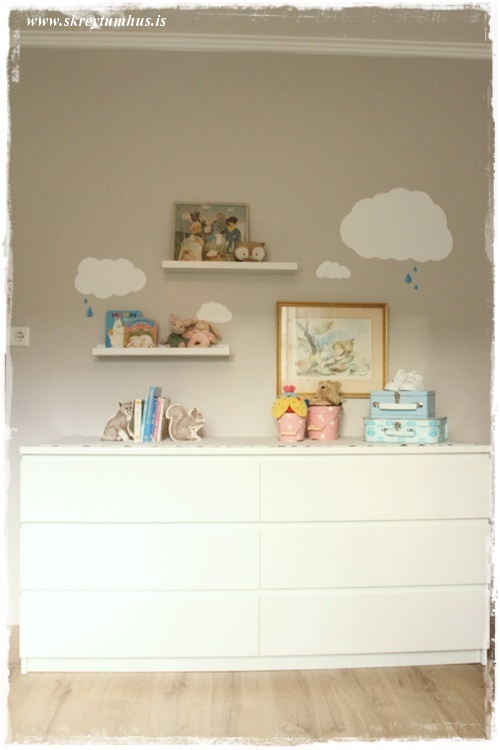 …veggirnir eru málaðir í Dömugráum frá Slippfélaginu, en ég get ekki mælt nóg með þessum lit. Hann er svo dásamlega mjúkur og hlýr, stundum bleikir tónar, og bara pörfekt á alla veggi. Ég fékk hins vegar þau í Art&Text til þess að útbúa skýjalímmiða fyrir okkur, og þeir gera svo ótrúlega mikið…