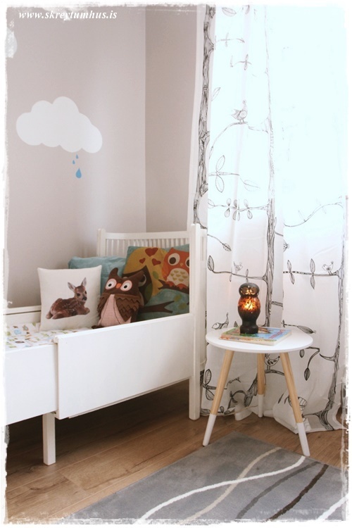 …við vildum gera hlýlegt, fallegt herbergi og alls ekki of væmið eða fullt af blúndum. Það er reyndar ansi margar uglur þarna, en það er vinnuheitið á kúlukrílinu. Útskýrir ýmislegt.