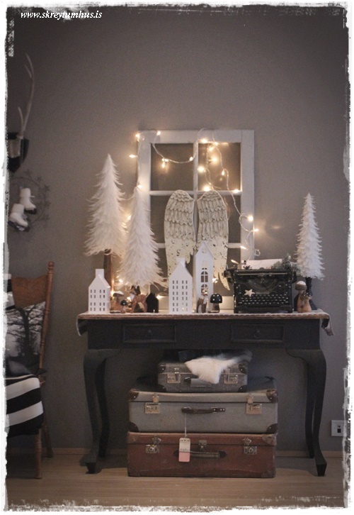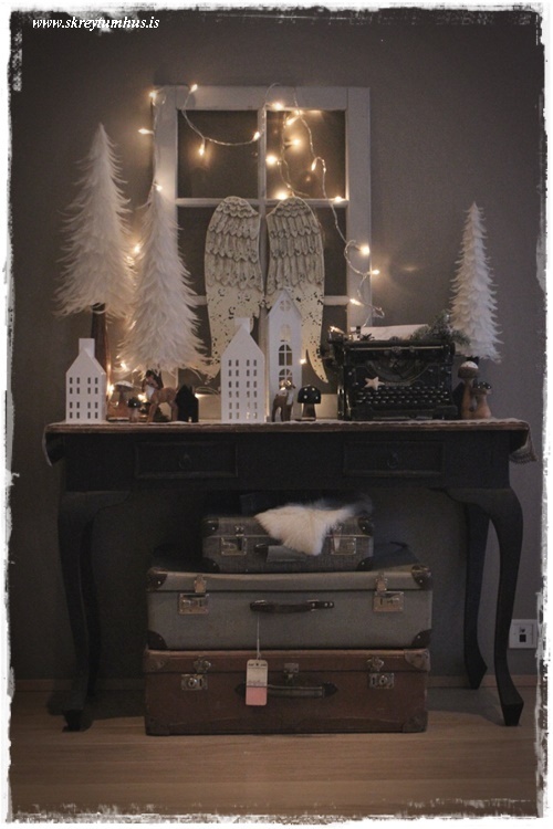 …borðið hefur tekið örlitlum stakkaskiptum.  Enda þurfti að koma mínum fjaðratrjám fyrir, og gráa glugganum, og auðvitað vængjunum og gömlu ritvélinni fallegu…