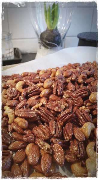Setjið í ofnskúffunuma ofan á smjörpappír og ristið í 20 til 30 mínútur en gætið þess að hræra til í þessu á ca 5 mínútna fresti því við viljum ekki að jólanammið okkar brenni við eða festist allt saman!