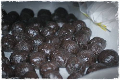 3. Móta litlar kúlur, leggja á bökunarplötu og setja inn í ísskáp í 1 – 2 tíma, eða þangað til vel stífar.